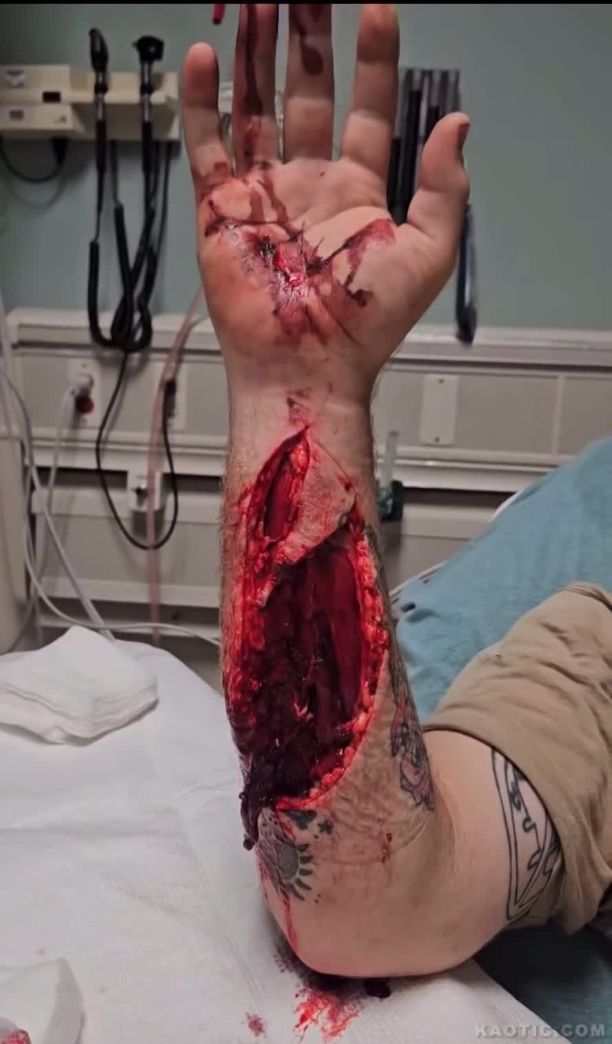 Man with gaping arm wound after falling through a window flexing to show tendons and ligaments working